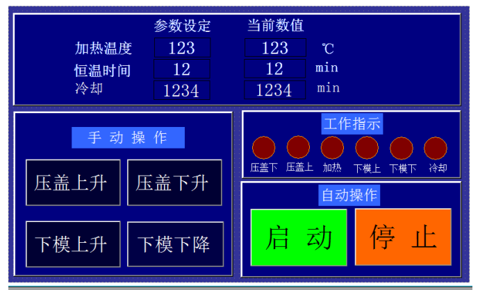 3、系統進入自動工作狀態,此時壓蓋下,下模上,加熱指示燈亮。設備進行自動加壓,加熱。